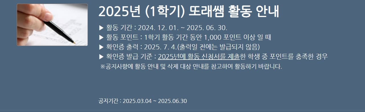 꿀박사 | 또래 활동 신청 방법, 신청 기간, 활동 내용, 활동 기간, 생기부 기록 여부 및 생기부 관리 (0) | 2025.03.13 |