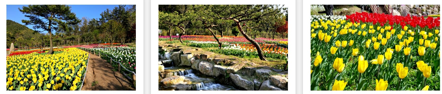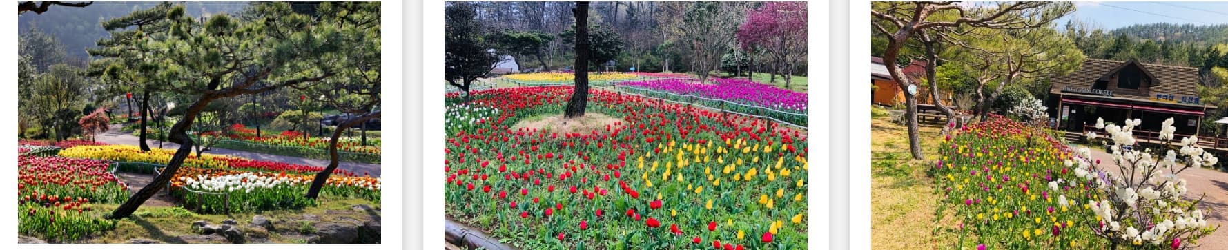 - 포토존: 메인 꽃길, 나무다리, 정자 뒤편 튤립언덕