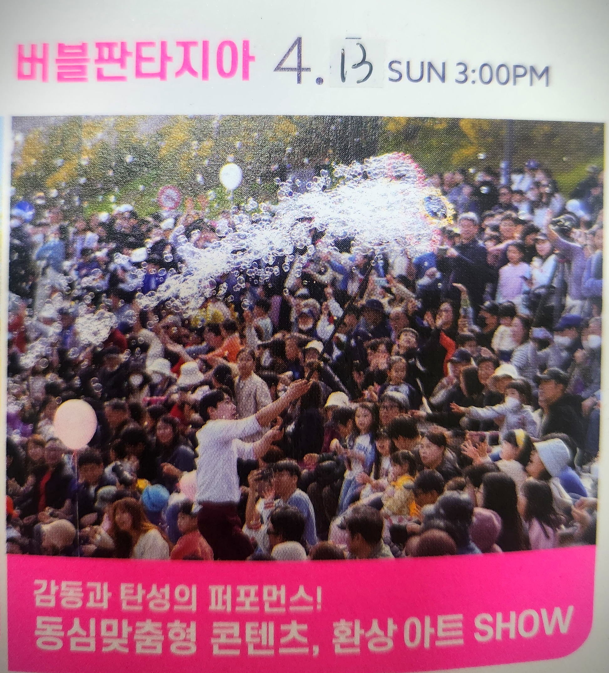 - 아이들과 함께 보기 좋은 버블 퍼포먼스는 일요일 낮으로 변경됐습니다!