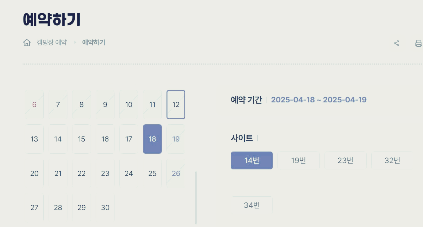 오른쪽에 예약 가능한 사이트(데크) 번호가 표시되요.