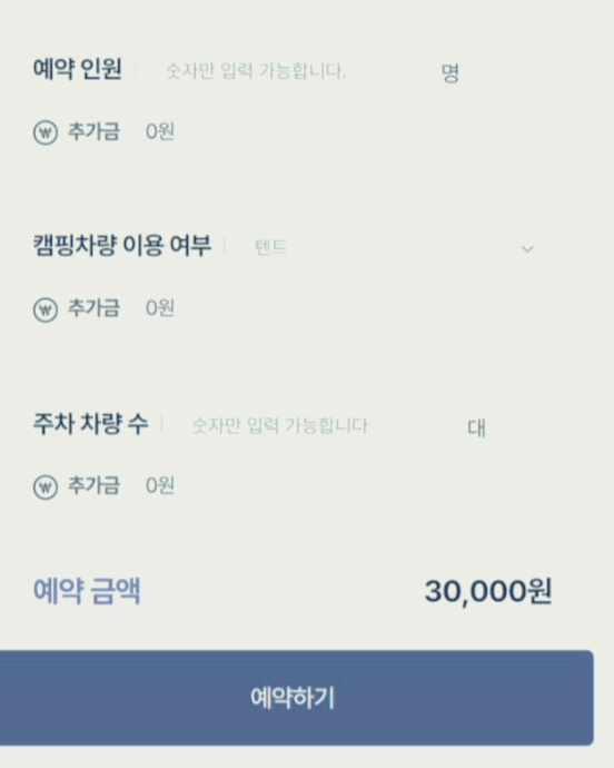 예약인원, 캠핑차량 여부, 주차차량 수를 선택하고