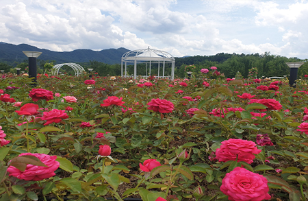 다양한 색을 머금은 장미들이 조형물 사이에서 활짝 피어나