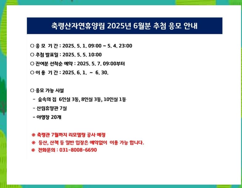 휴양림은 특히 5월~6월 사이가 가장 인기 시즌이니, 미리 예약 필수!