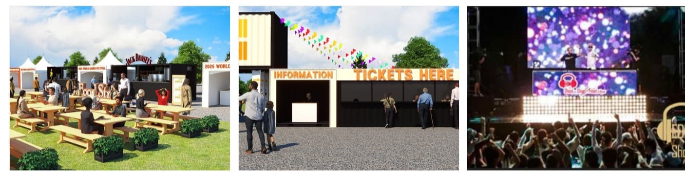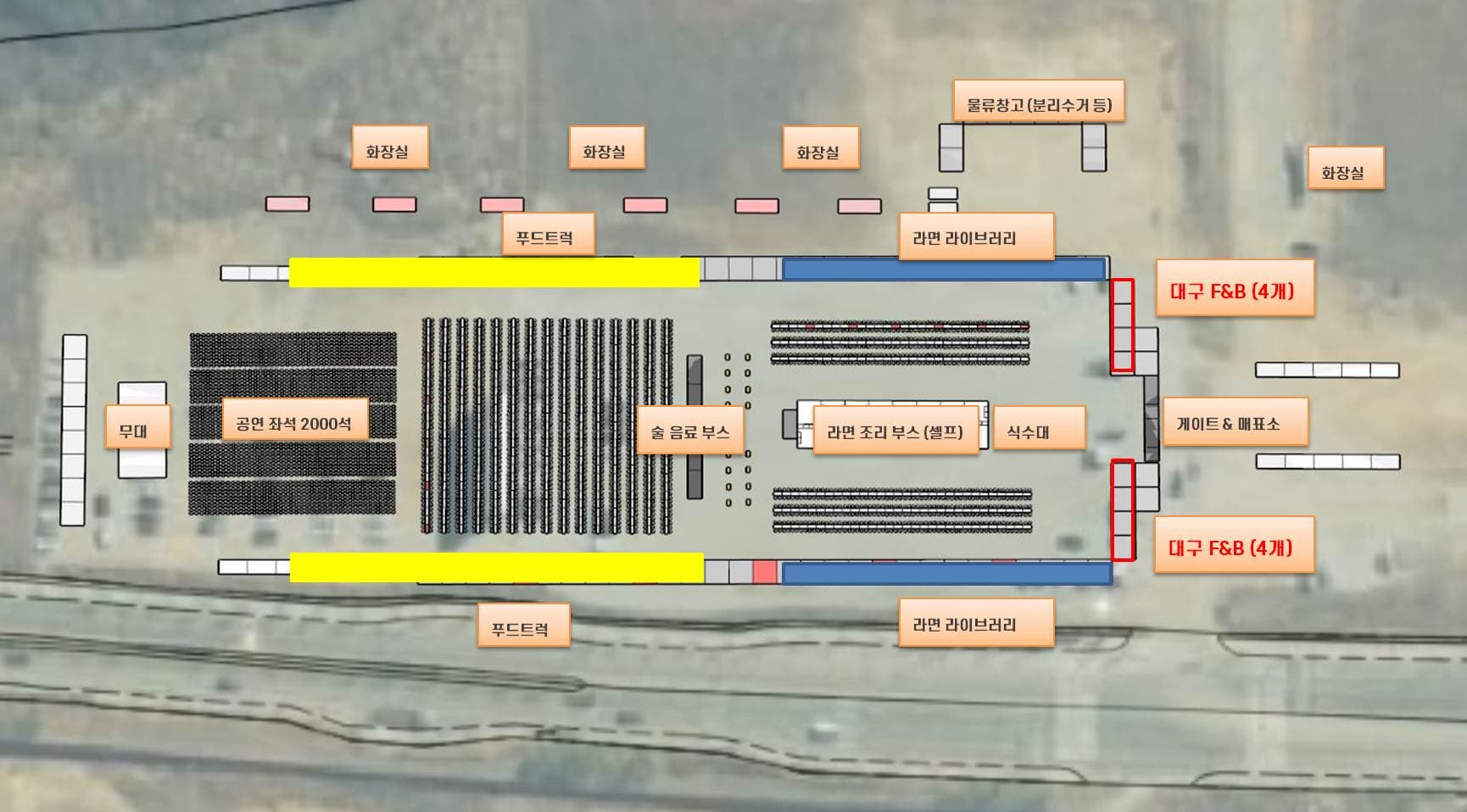 - 우측: 입장 게이트 / 대형 F&B 부스 / 굿즈샵 / 라면 라이브러리