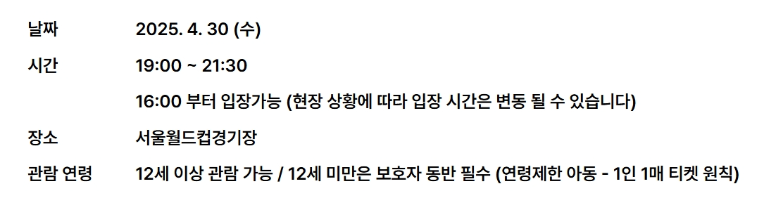 | 원더쇼 | 4월 30일(수) | 19:00 | 서울월드컵경기장 | 오프닝 K-POP 콘서트 |