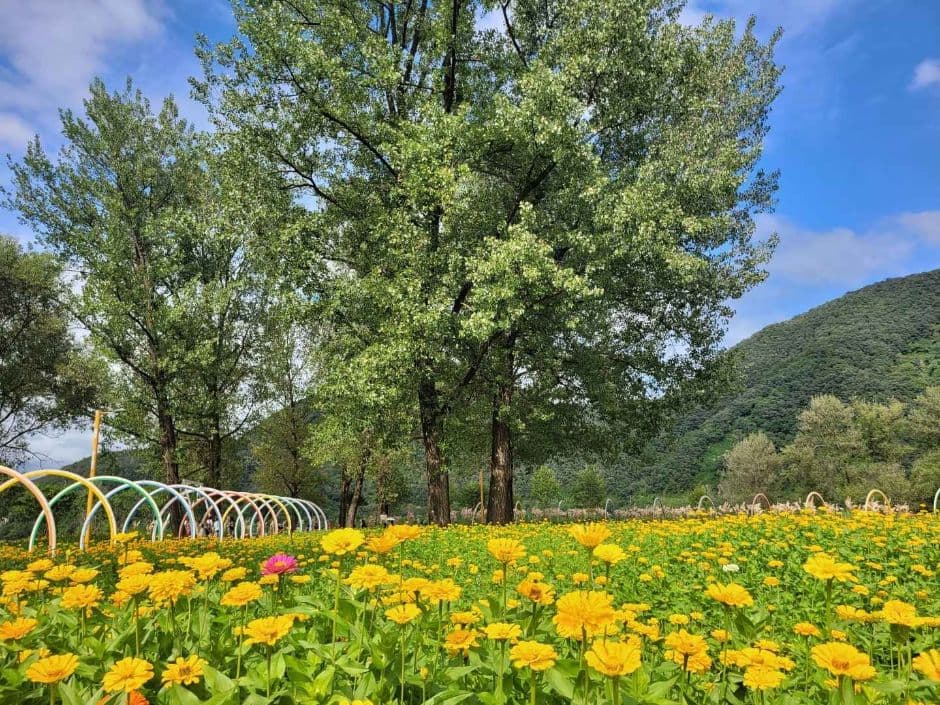 꽃 종류도 풍성해 양귀비, 수레국화, 청유채, 하늘바라기 등 다양한 꽃들이 파노라마처럼 펼쳐집니다.